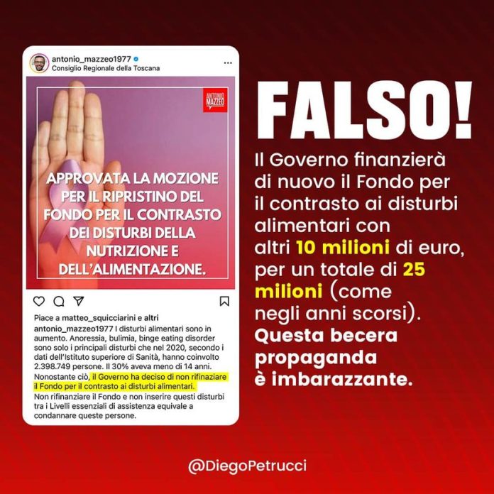 Per il 2022 e il 2023 il fondo del Governo ammontava a 25 milioni di euro (10 milioni per il 2022 e 15 milioni per il 2023). La rendicontazione delle Regioni ha evidenziato che circa 15 milioni di euro (cioè l’ammontare per il 2023) non sono stati spesi pertanto il Governo ha stanziato in Manovra quella cifra. Grazie ad un emendamento al Milleproroghe dei deputati Roscani e La Porta al fondo sono aggiunti 10 milioni di euro. E non solo, il Governo è impegnato in prima linea nella lotta ai DNA tanto da voler rendere strutturale il fondo e da aprile saranno attivate altre 16 nuove prestazioni nell’ambito dei disturbi della nutrizione e dell’alimentazione arrivando a 32.