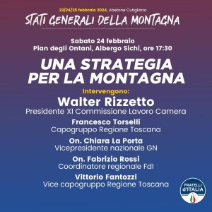 Firenze, 20 febbraio 2024: “Questo fine settimana, dal 23 al 25 febbraio, ad Abetone-Cutigliano si terrà la terza edizione degli Stati Generali della Montagna di Fratelli d’Italia in Toscana. Una tre giorni dedicata alla scoperta del nostro Appennino e a un confronto sul suo futuro, che vedrà la presenza di importanti esponenti di Fratelli d’Italia.