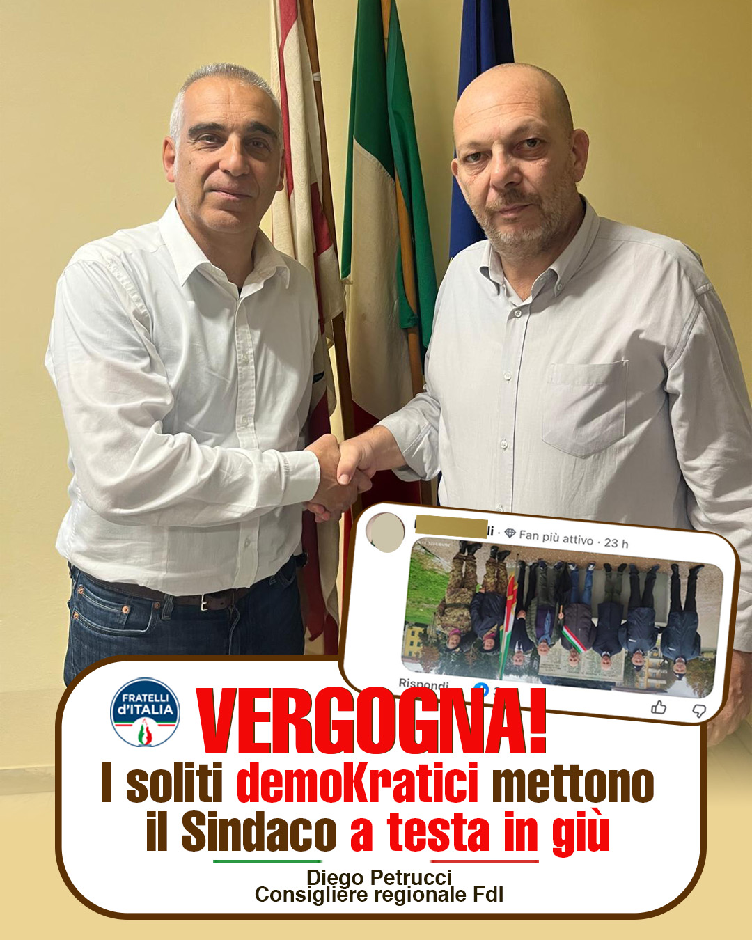 Oggi pomeriggio sono voluto andare direttamente in Comune a Castelfranco di Sotto a salutare ed abbracciare il Sindaco Fabio Mini e con lui gli assessori, le Forze dell’Ordine e tutta la comunità che rappresentano e che qualcuno vorrebbe a testa in giù! Fabio è uno dei migliori amministratori della provincia di Pisa e certo non si farà intimorire da qualche violento che mi auguro venga punito con fermezza!