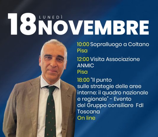 Pisa, 18 novembre 2024: Questa mattina il consigliere regionale di Fratelli d’Italia e coordinatore cittadino FdI Diego Petrucci assieme alla...